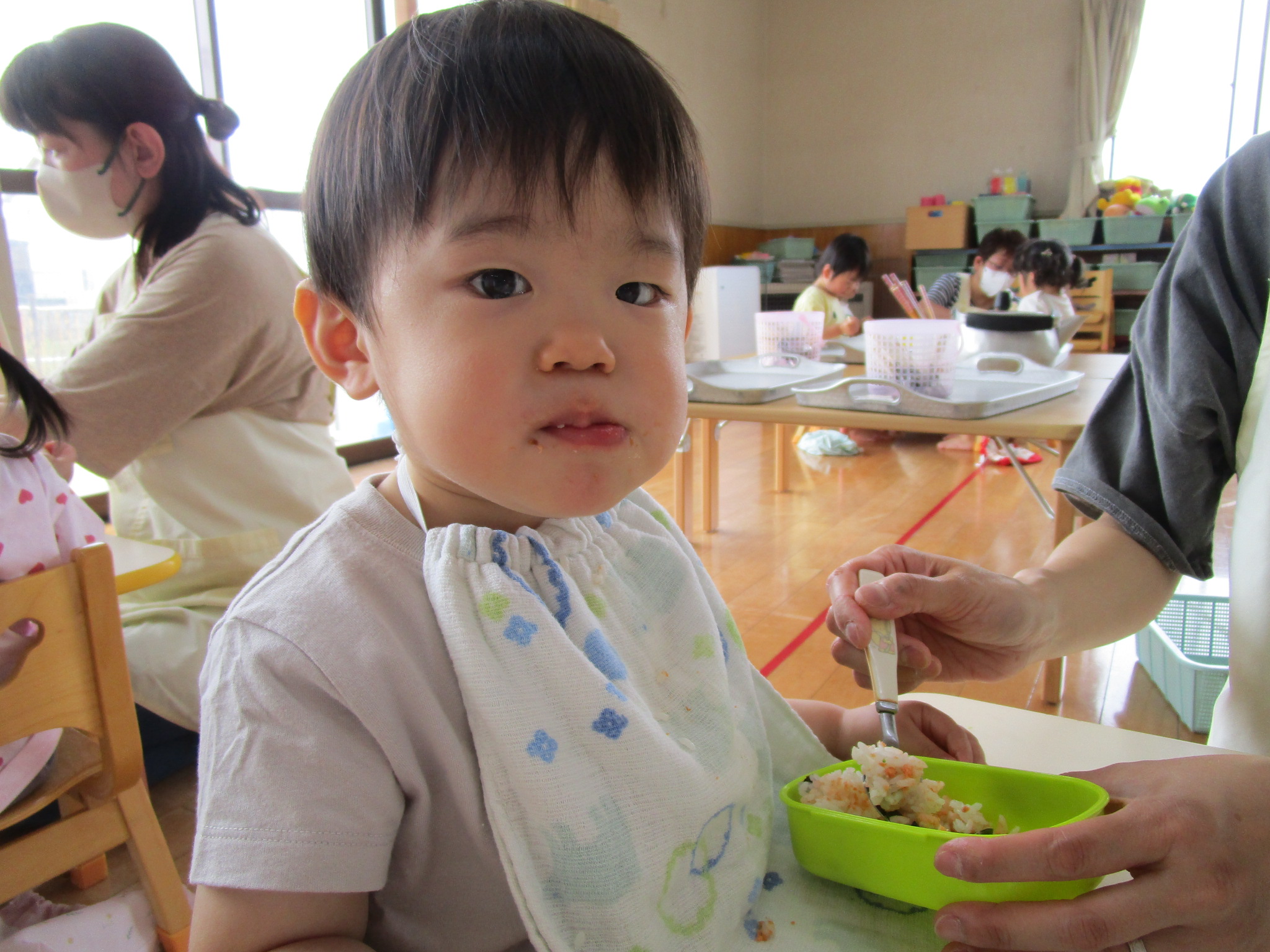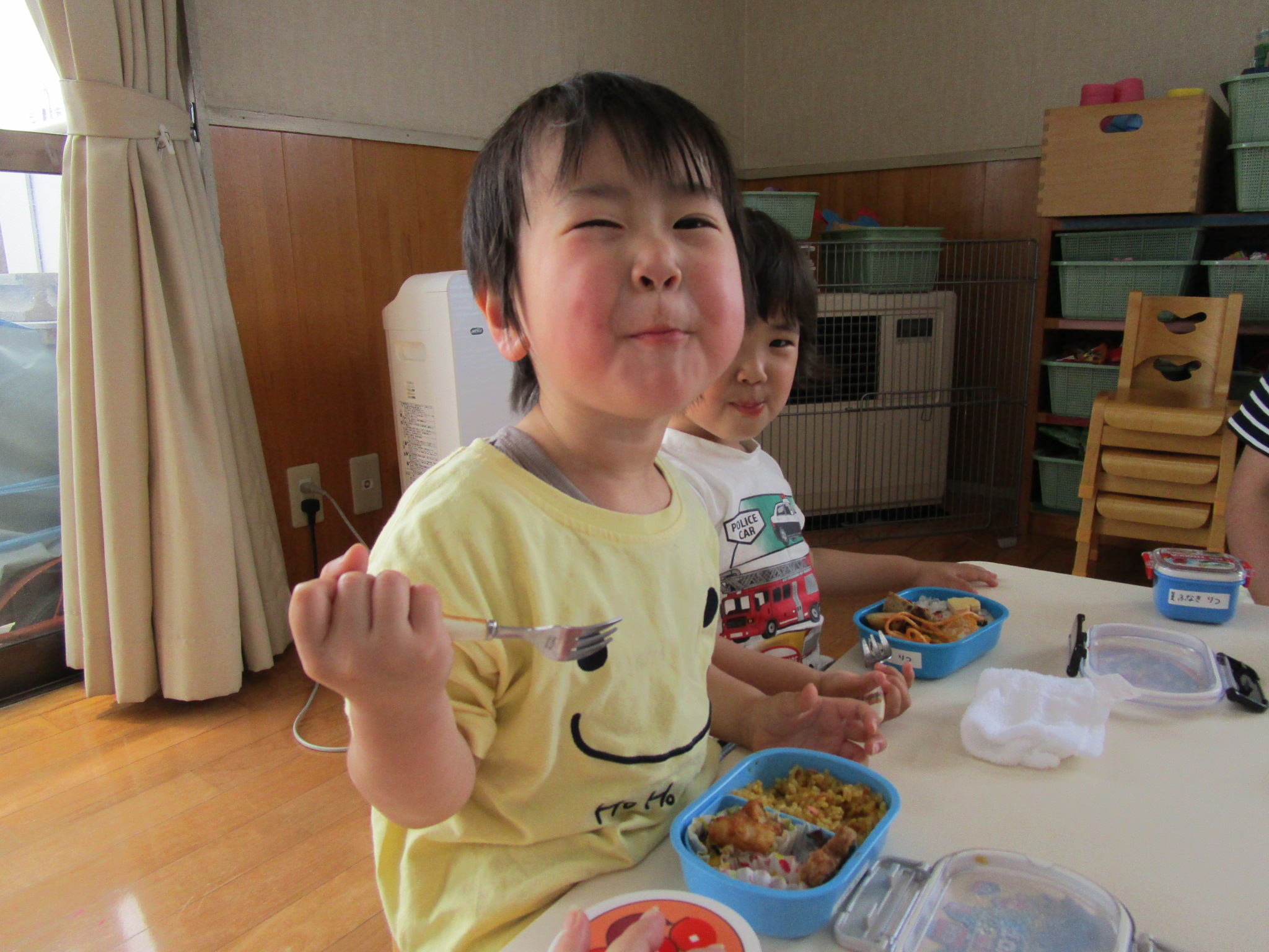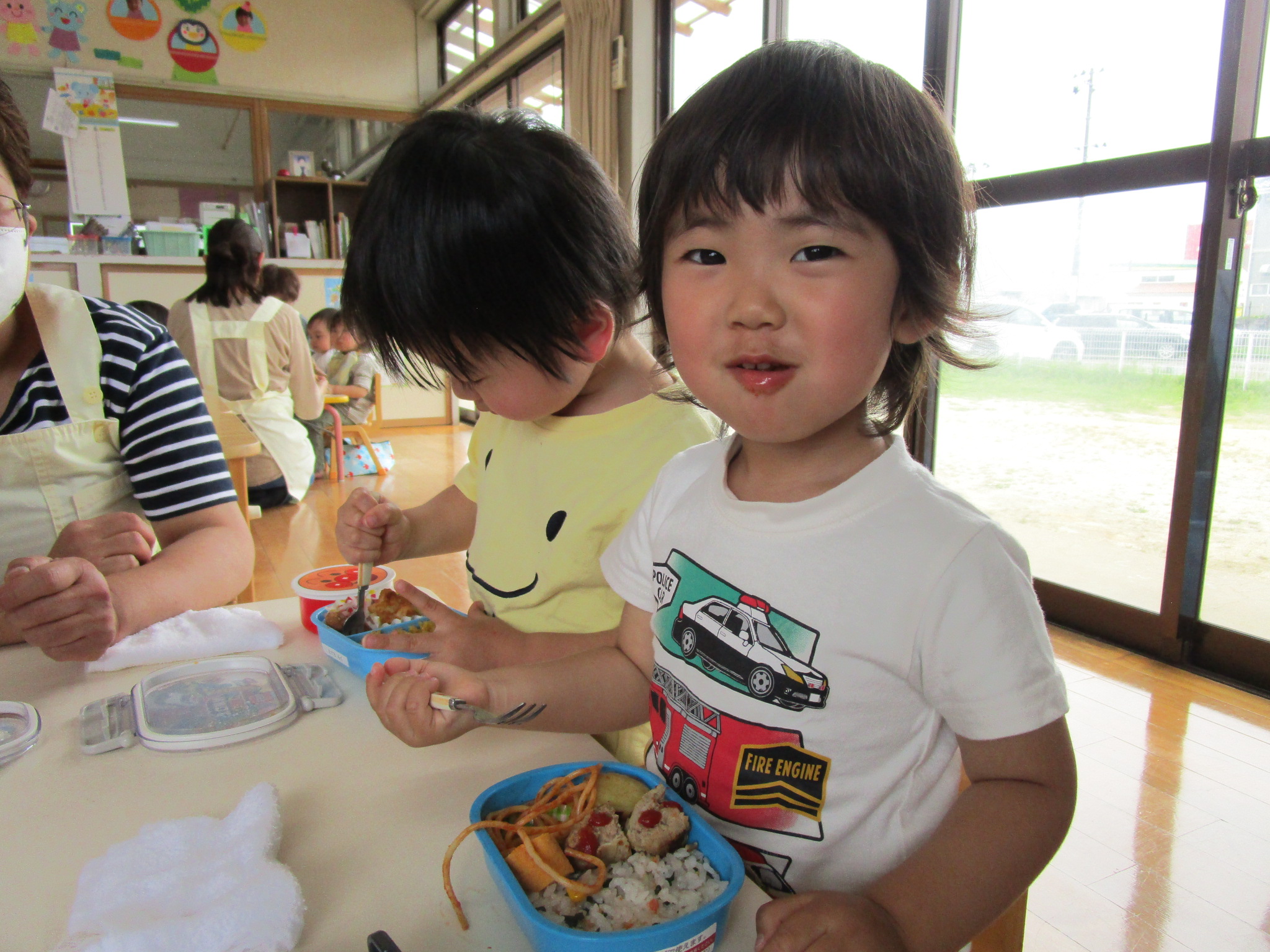 今年度初めてのお弁当の日でした。豆の木保育園では、暑い時期を除いて年に6回ほどお弁当の日があります。子どもたちは、お弁当の日が大好き!いつもより早めにお腹すいて“早く食べよう!”とウキウキです。ちゅうりっぷ組は、とにかく食べることに夢中。もぐもぐ…ぱくぱく…お弁当を味わいました。たんぽぽ組は、お兄さんとお姉さんの余裕あり!お友だちのお弁当をのぞいたり、会話も楽しみながらのお弁当タイムになりました。保護者の方には、ご協力いただき感謝いたします。今年度もよろしくお願いいたします。