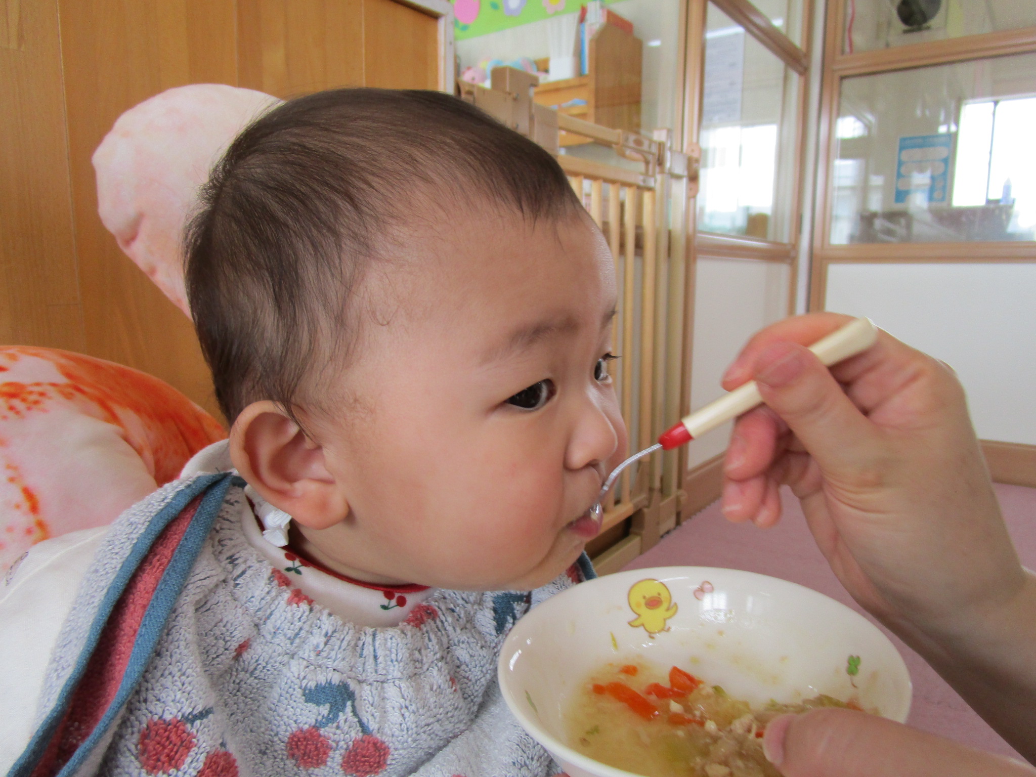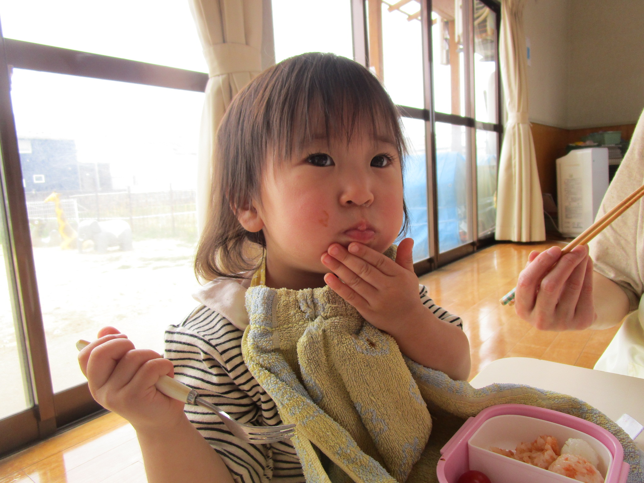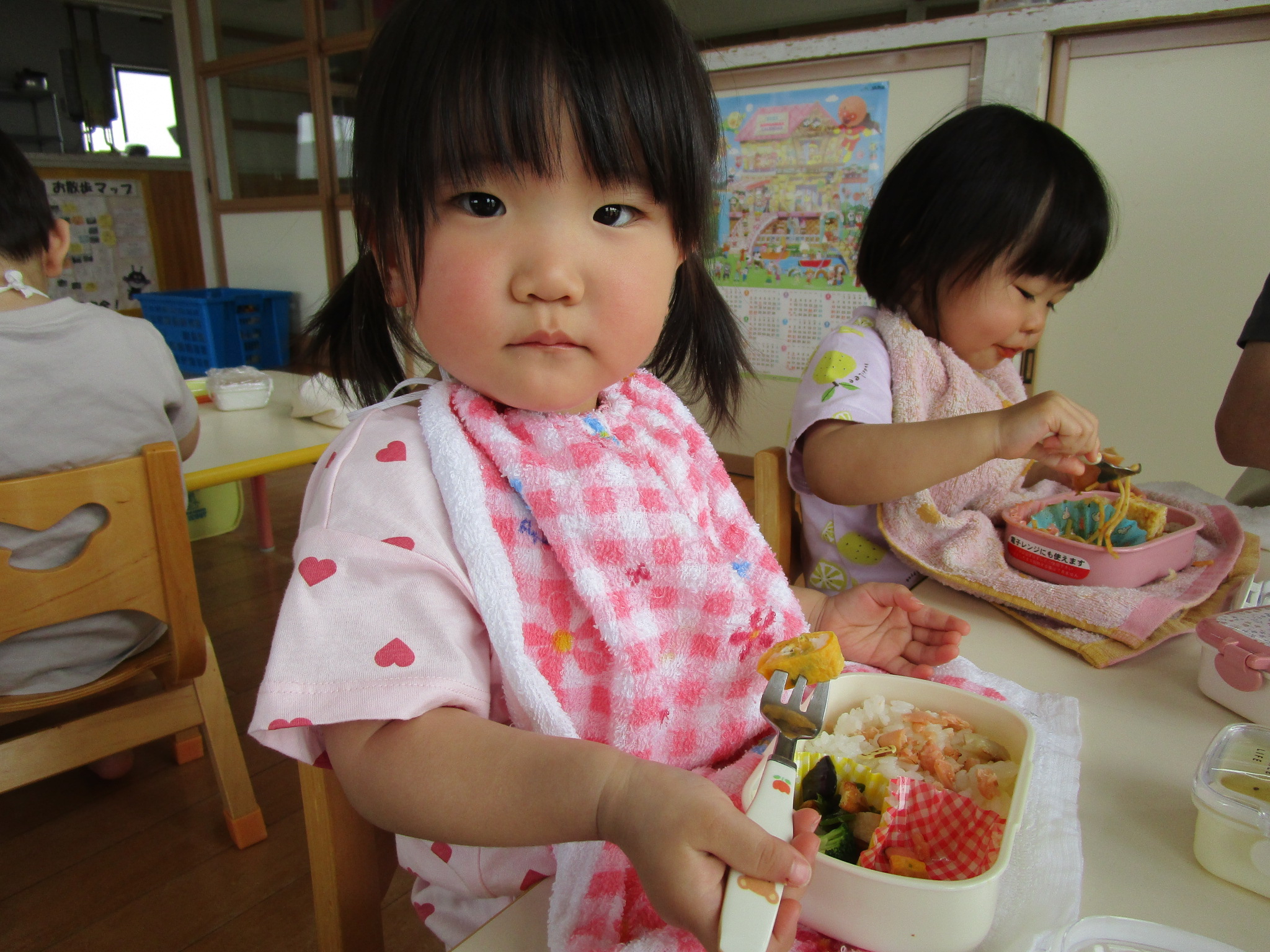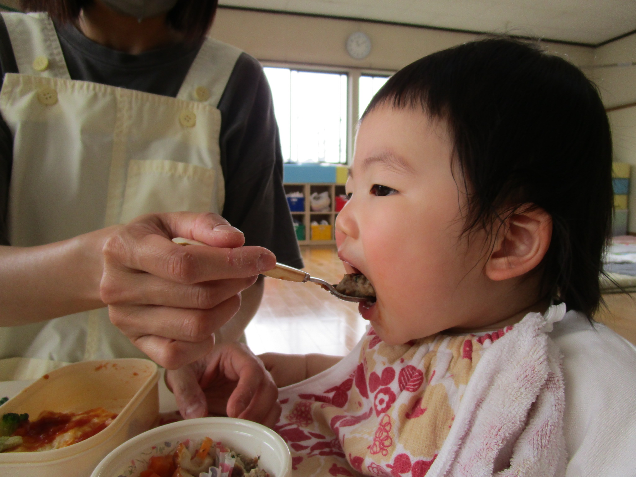 今年度初めてのお弁当の日でした。豆の木保育園では、暑い時期を除いて年に6回ほどお弁当の日があります。子どもたちは、お弁当の日が大好き!いつもより早めにお腹すいて“早く食べよう!”とウキウキです。ちゅうりっぷ組は、とにかく食べることに夢中。もぐもぐ…ぱくぱく…お弁当を味わいました。たんぽぽ組は、お兄さんとお姉さんの余裕あり!お友だちのお弁当をのぞいたり、会話も楽しみながらのお弁当タイムになりました。保護者の方には、ご協力いただき感謝いたします。今年度もよろしくお願いいたします。