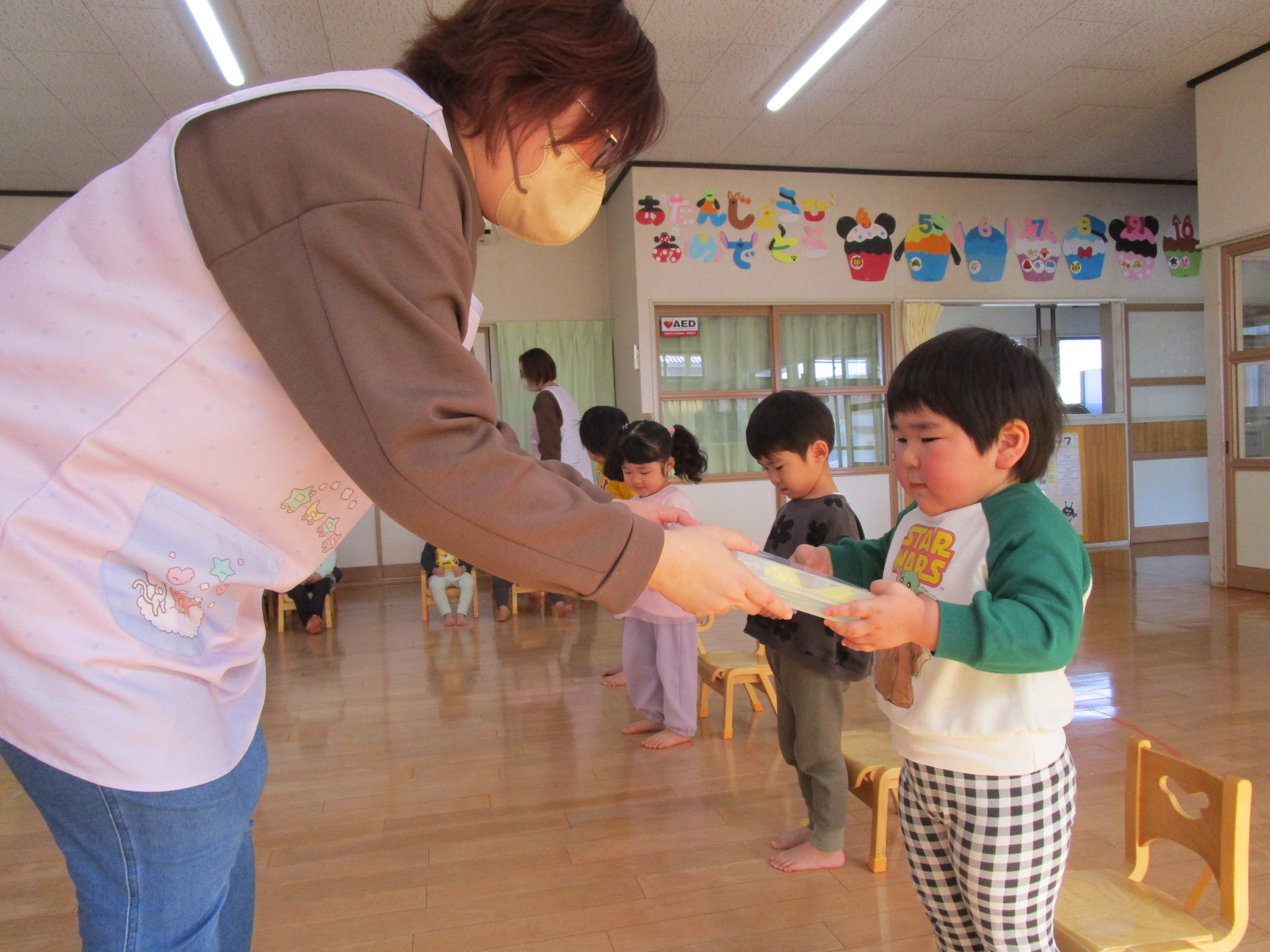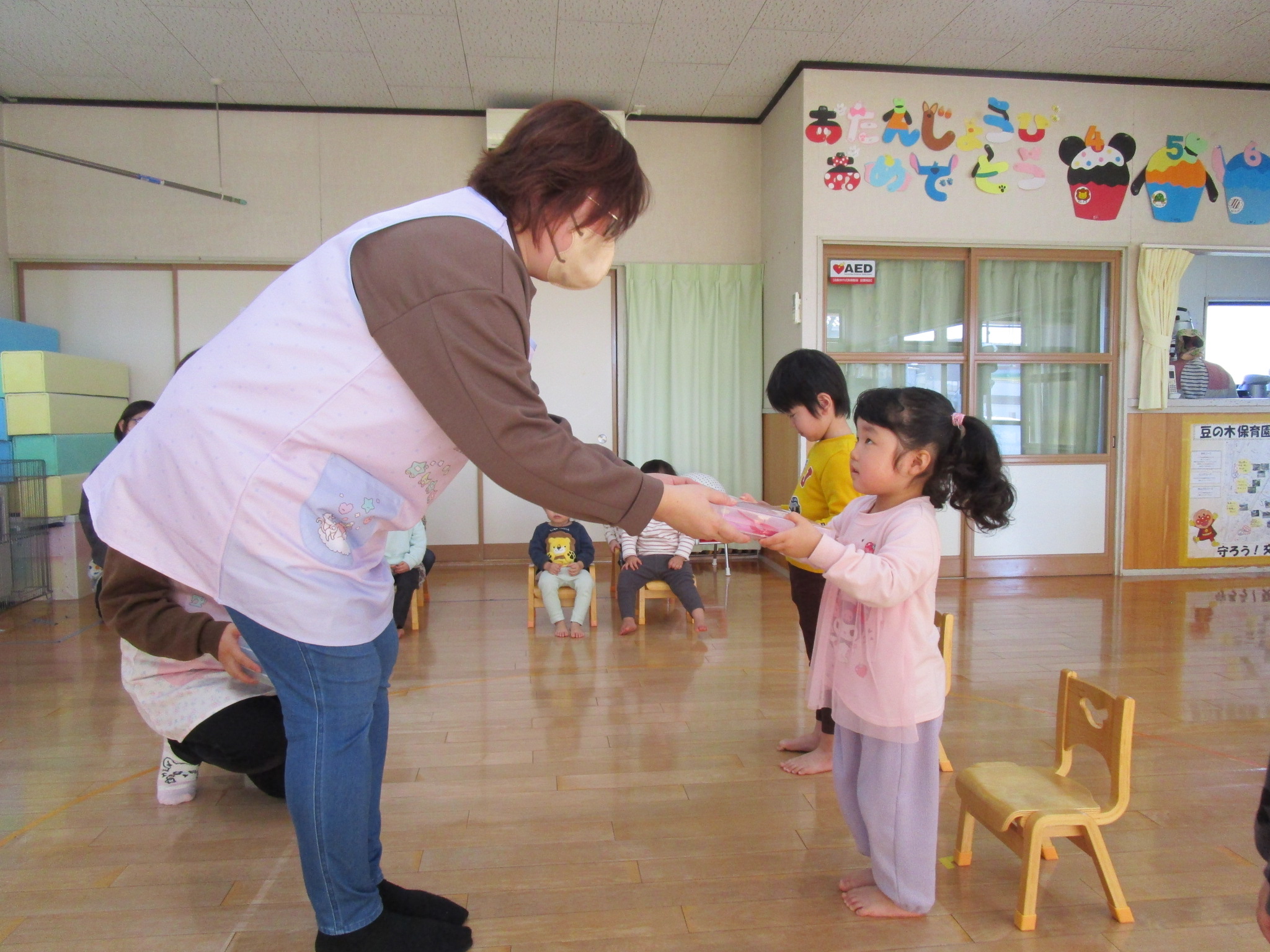 もも組さんとちゅうりっぷ組さんは、手あそびでたんぽぽ組さんをお祝いしてくれました。アルバムにアップしてあります。