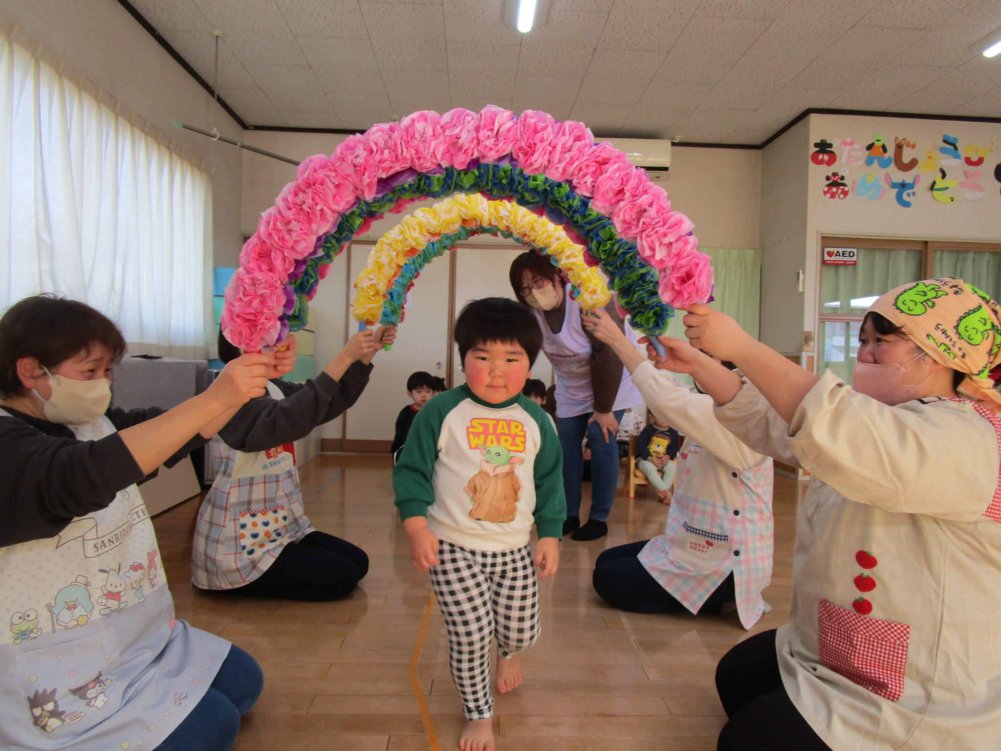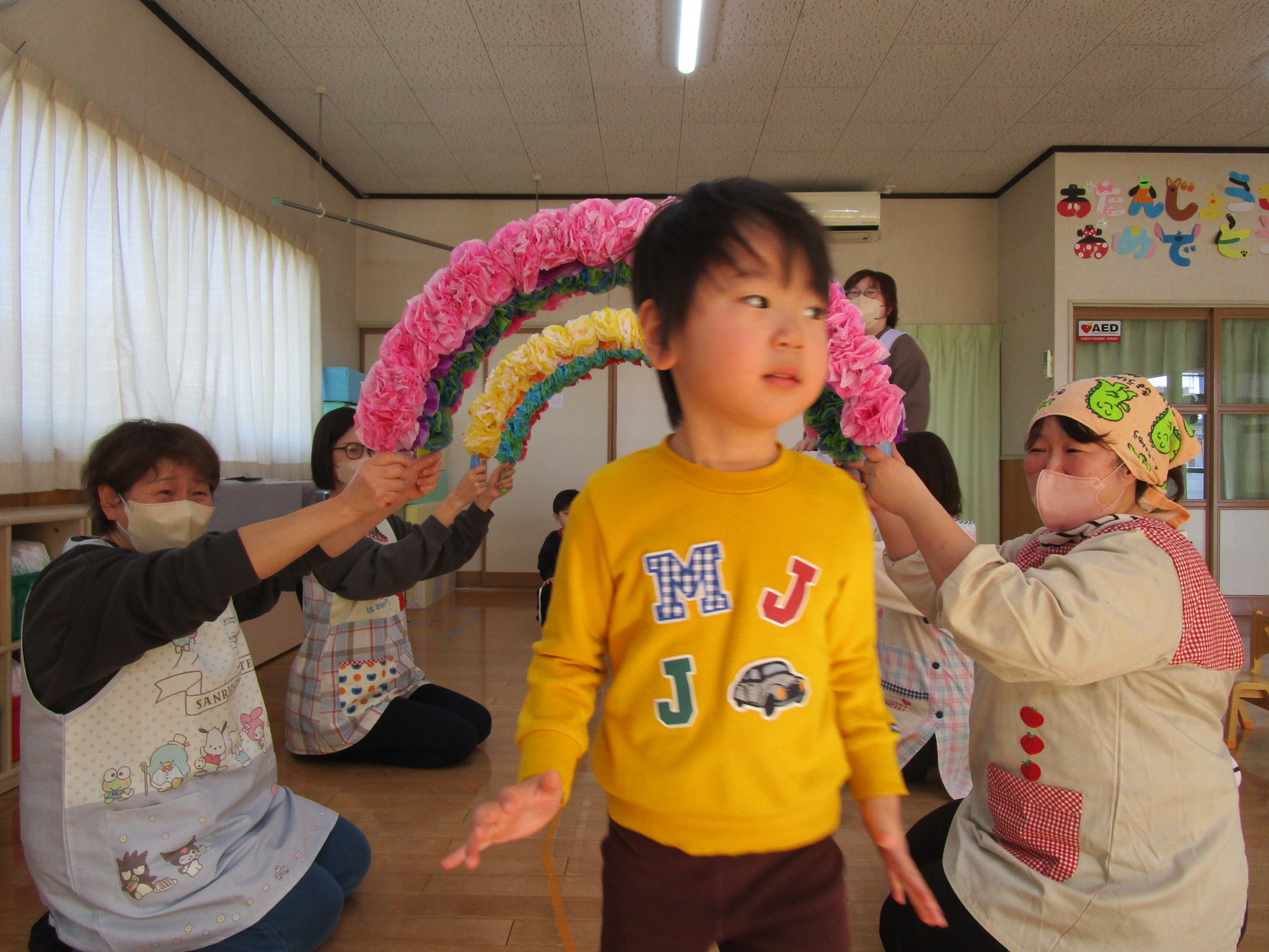 たんぽぽ組さんはいつも穏やかで仲良し、でもちょっぴり新しいことにチャレンジするときは緊張したり、慎重になったりすることが多いクラスでした。保育園で生活する中で困難にぶつかり、困ったとき、不安になったとき、泣いてしまったときもあったね。そんな時は、保育士に気持ちを受け止めてもらい、友だちに慰められて一つ一つ乗り越えてきました。年度の後半になるとそんな姿も少しずつ減り、自分でどうしたらよいか考えたり、「こうしてみるといいんじゃない?」と友だちに提案したりされたりする姿が見られるようになりました。そして、たくさんの経験がみんなの自信になったね。