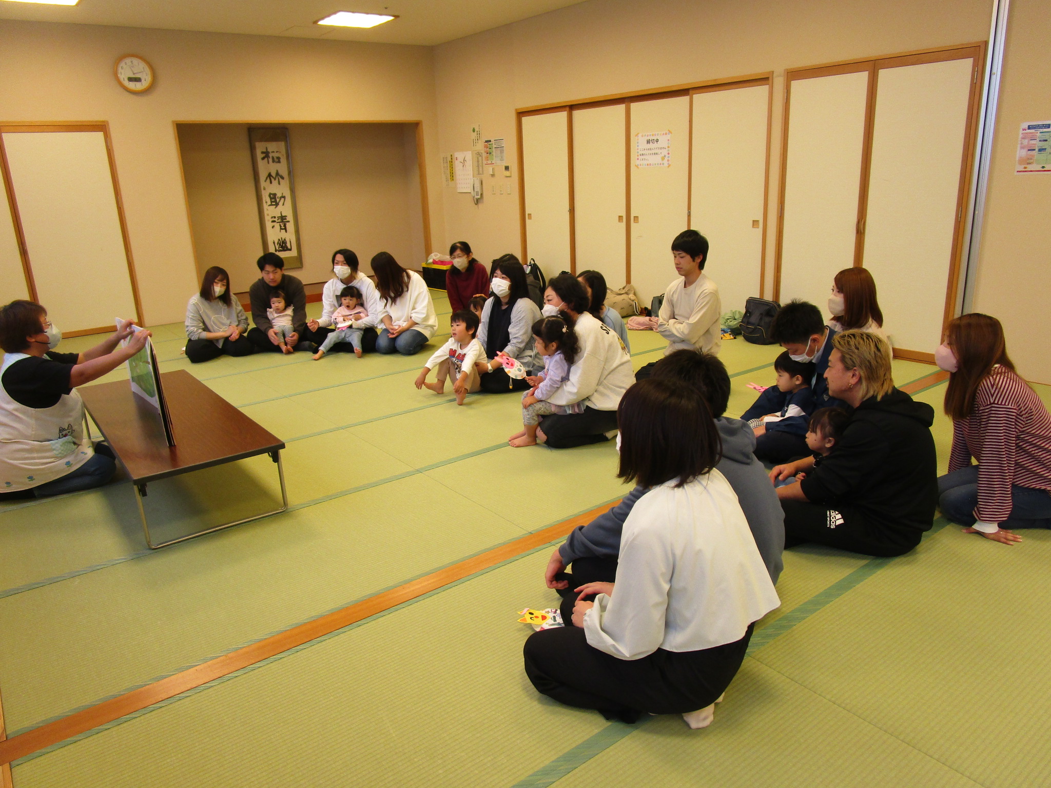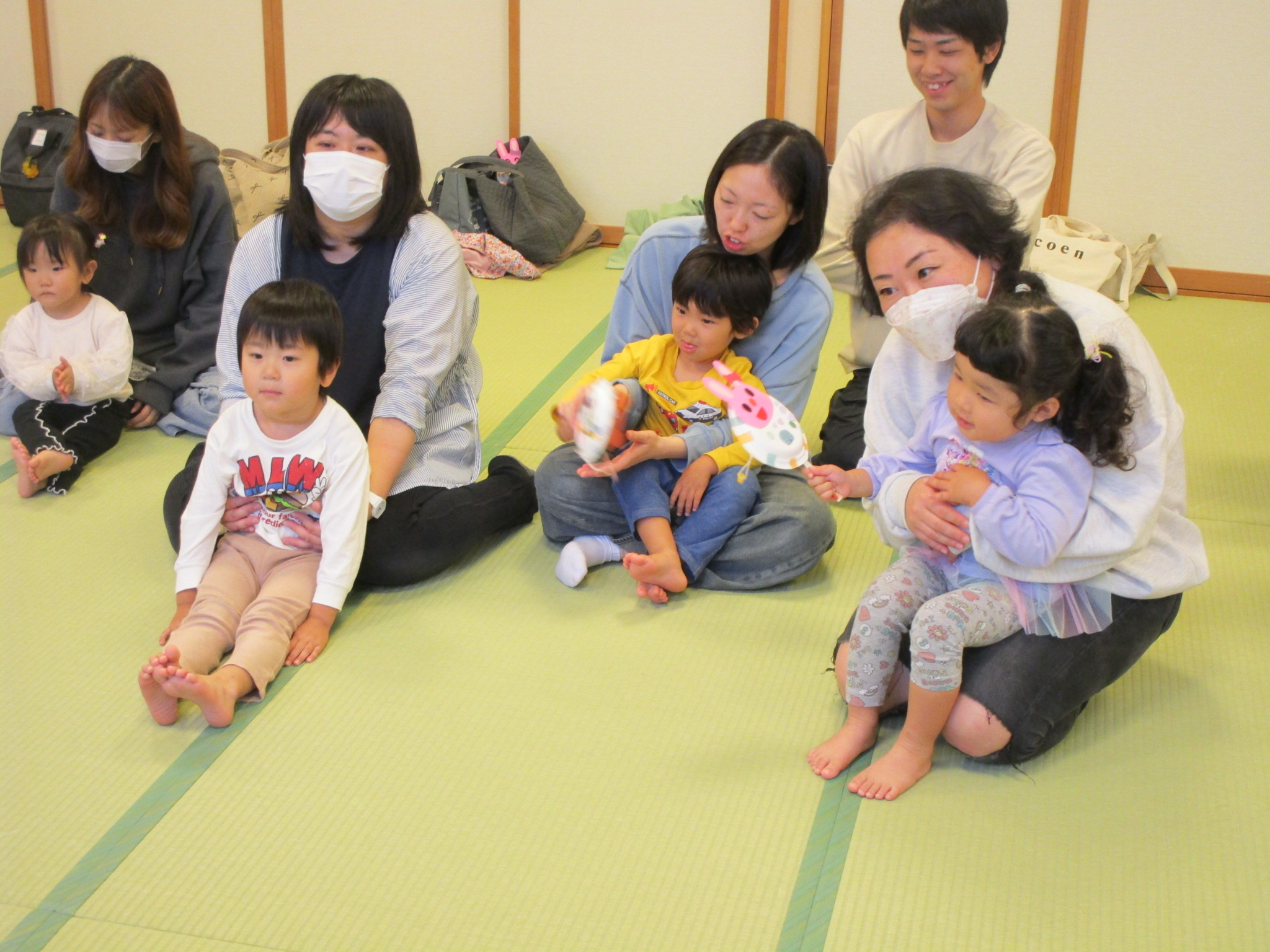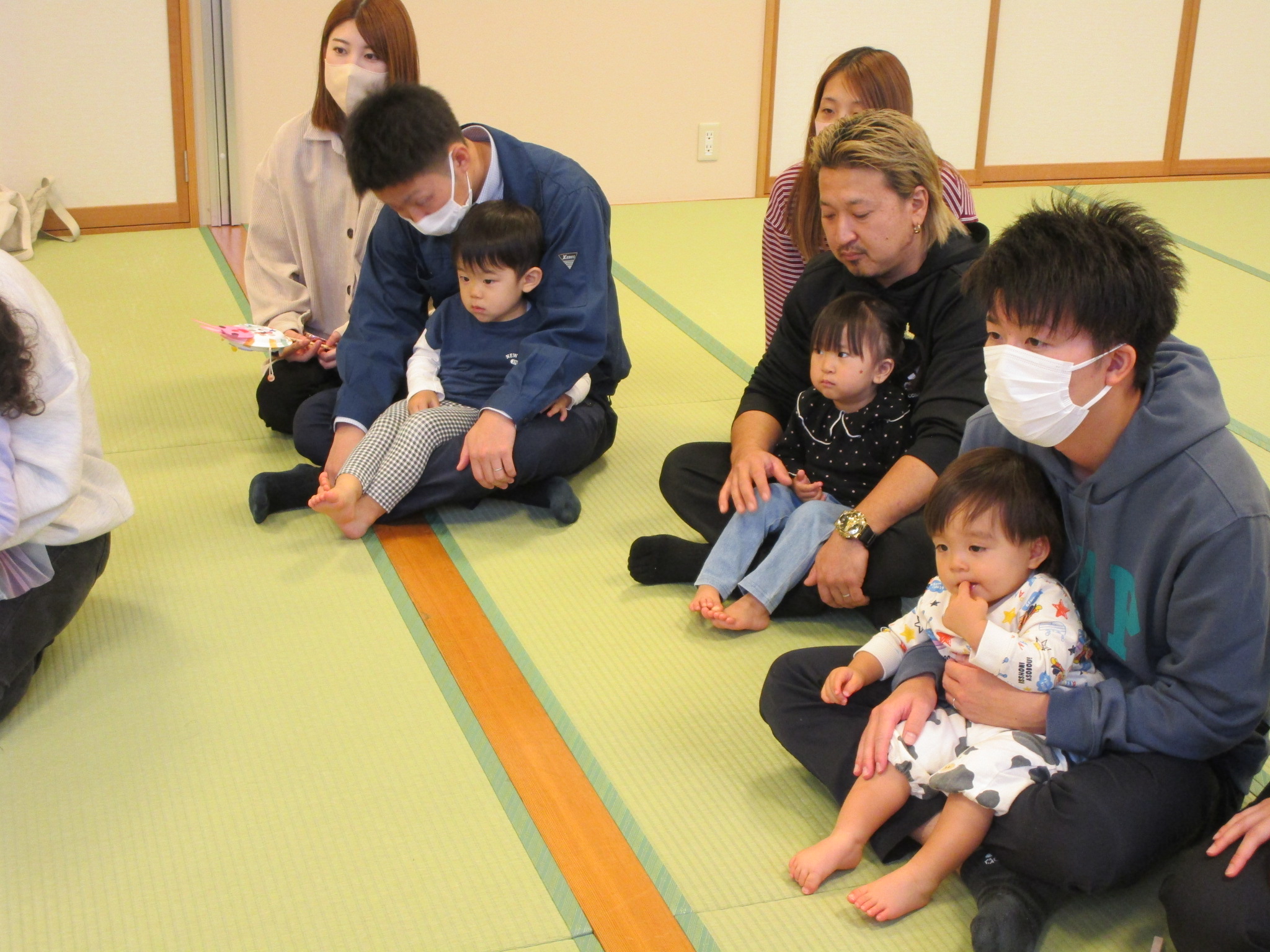 10/16に、ちゅうりっぷ組とたんぽぽ組の子どもたちと保護者の方を対象にキタスカで“親子レクリエーション”を開催しました。保護者の方からいただいた「もっと子どもと一緒に楽しみたい!」という意見を参考に、保育園で見ているお話や手あそびなどを一緒に行ったり、製作をして“でんでん太鼓”を作ったり…。私たちも保護者の方とコミュニケーションをとりながらの親子レクリエーションとなり、大変楽しい時間となりました。そしてなにより、子どもたちのニコニコなお顔!お父さんやお母さんとたくさんふれあい、たっぷり甘えてとても嬉しそうでしたね。今後も、子どもたちや保護者の方が楽しめる行事の在り方を考えていきたいと思っています。ご参加ありがとうございました。