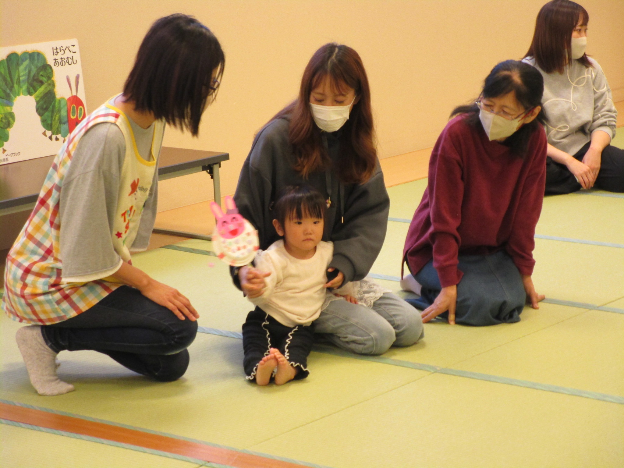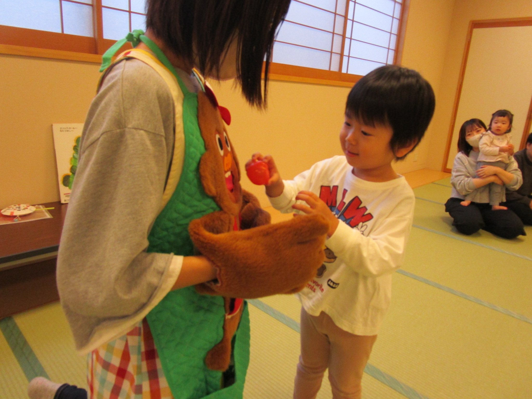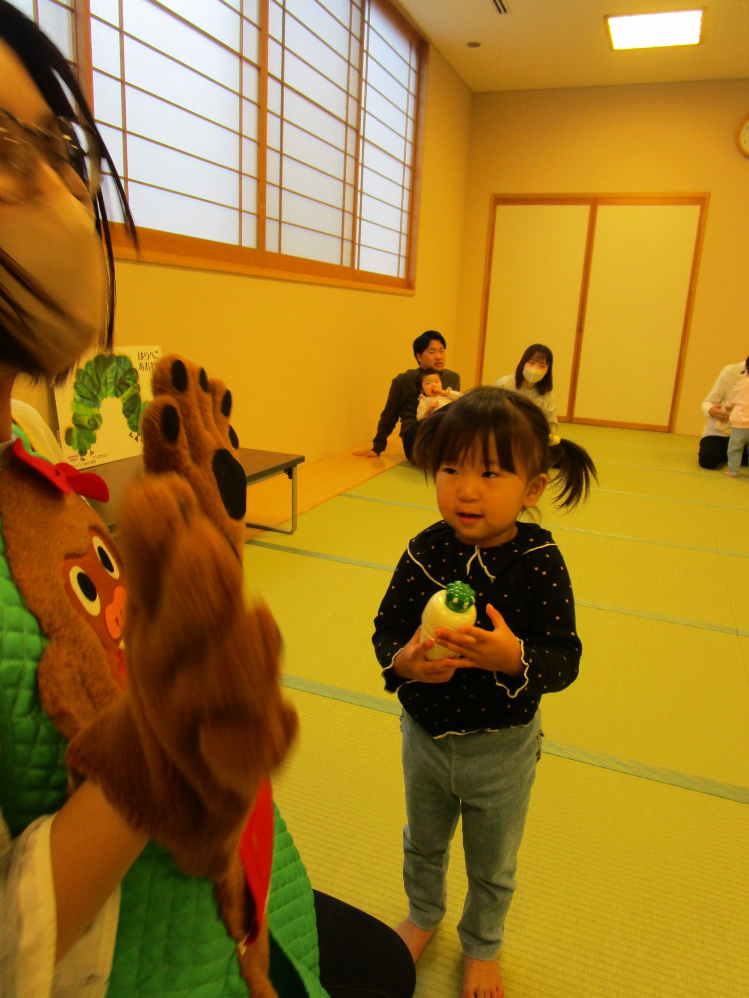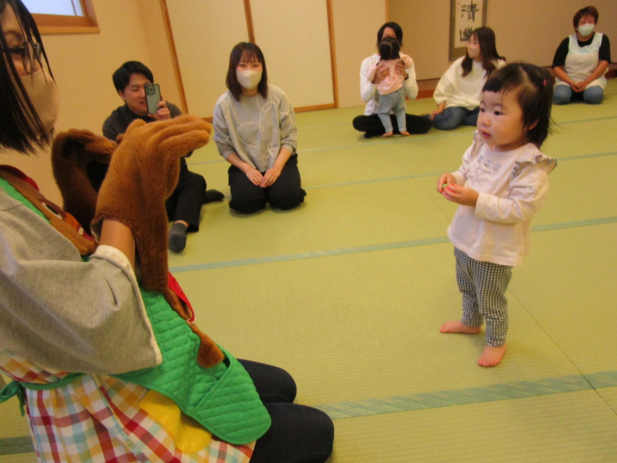 10/16に、ちゅうりっぷ組とたんぽぽ組の子どもたちと保護者の方を対象にキタスカで“親子レクリエーション”を開催しました。保護者の方からいただいた「もっと子どもと一緒に楽しみたい!」という意見を参考に、保育園で見ているお話や手あそびなどを一緒に行ったり、製作をして“でんでん太鼓”を作ったり…。私たちも保護者の方とコミュニケーションをとりながらの親子レクリエーションとなり、大変楽しい時間となりました。そしてなにより、子どもたちのニコニコなお顔!お父さんやお母さんとたくさんふれあい、たっぷり甘えてとても嬉しそうでしたね。今後も、子どもたちや保護者の方が楽しめる行事の在り方を考えていきたいと思っています。ご参加ありがとうございました。