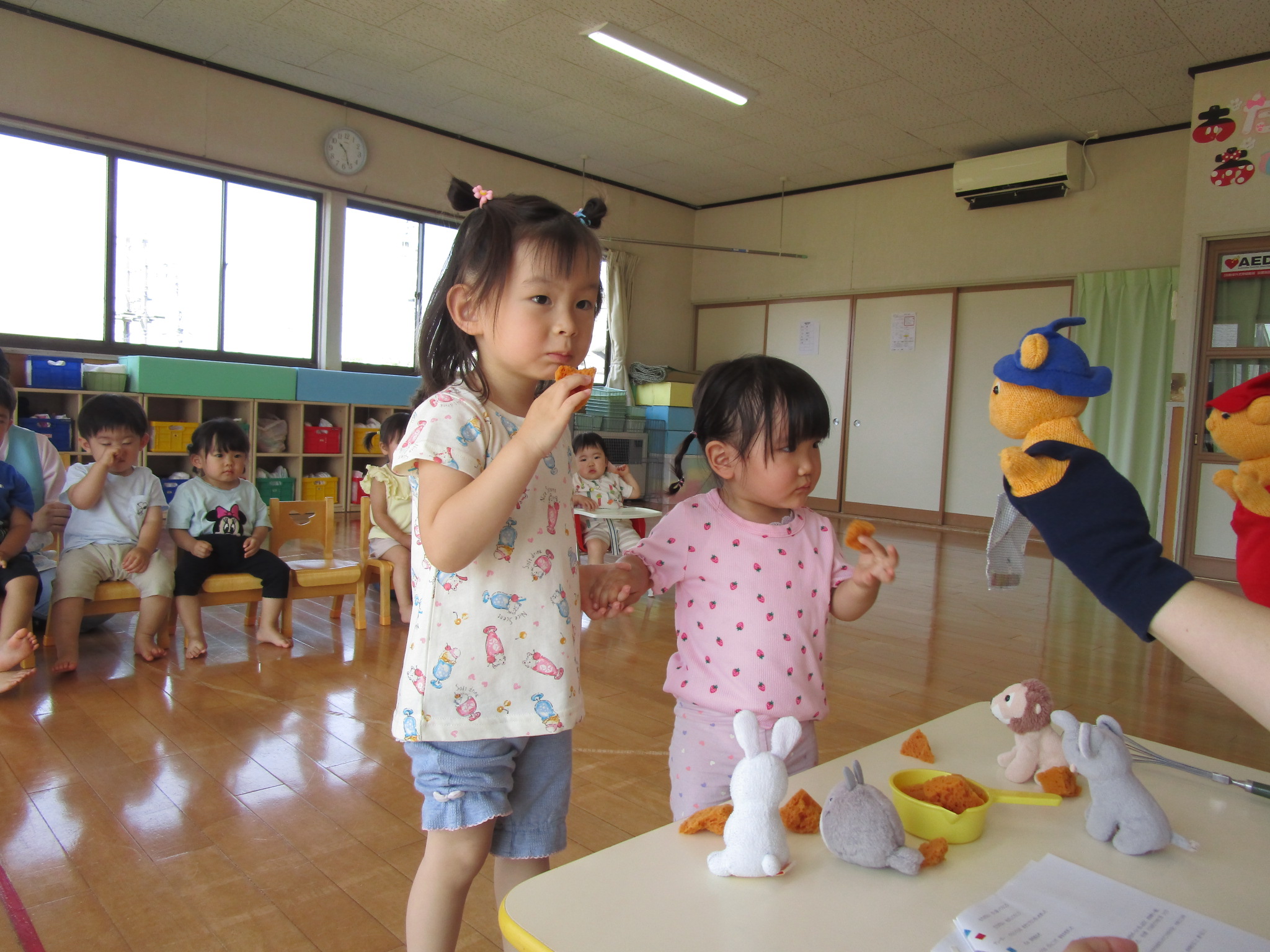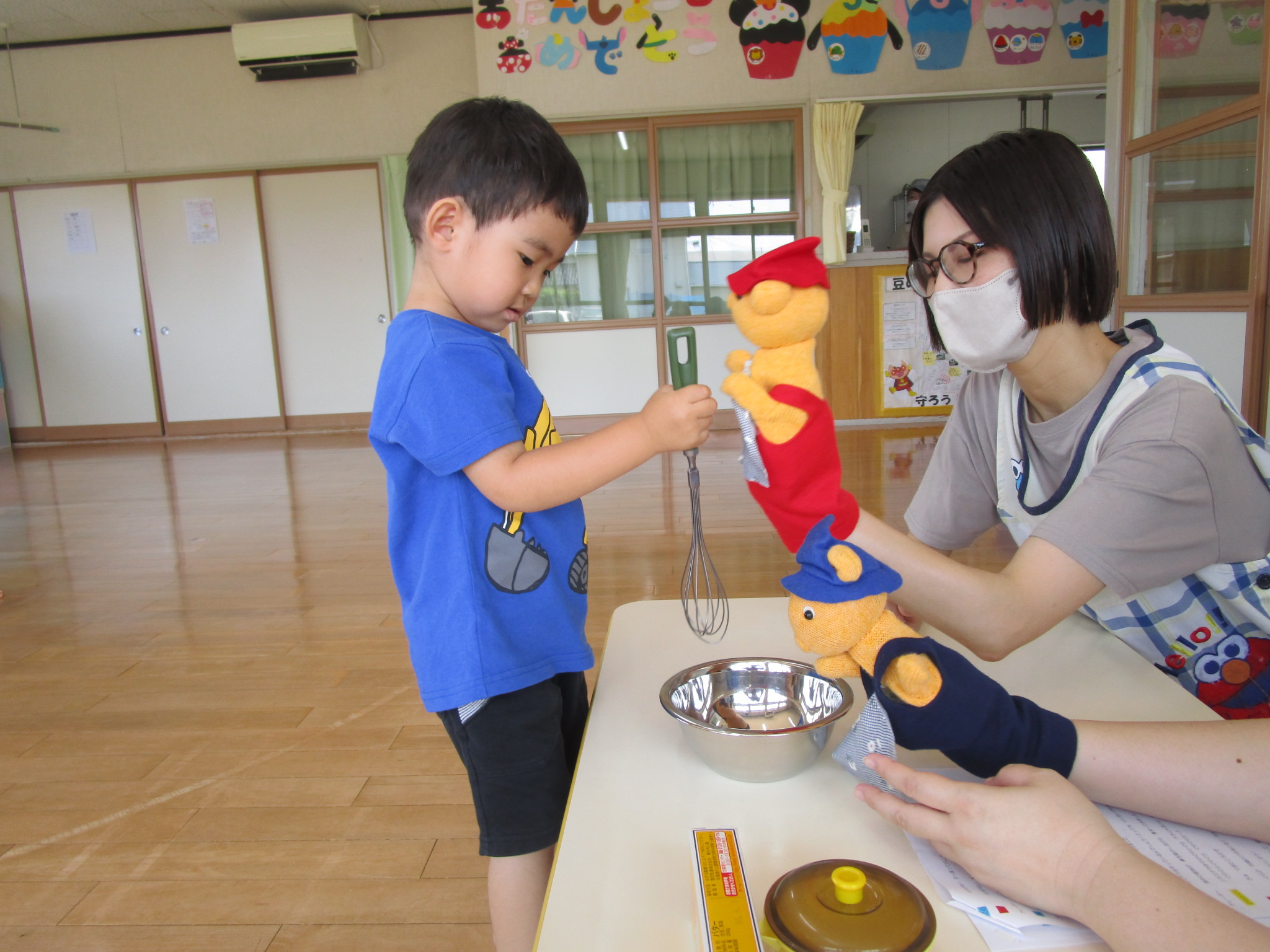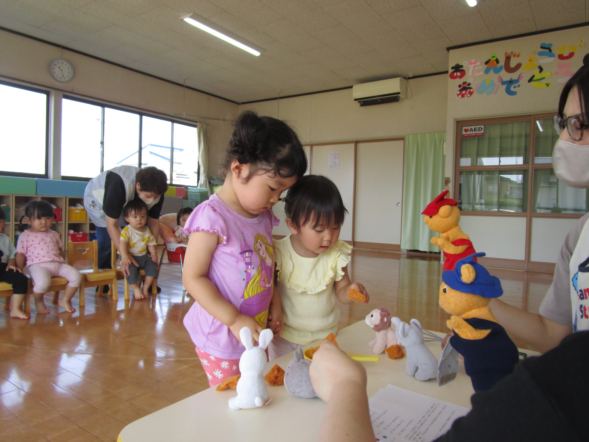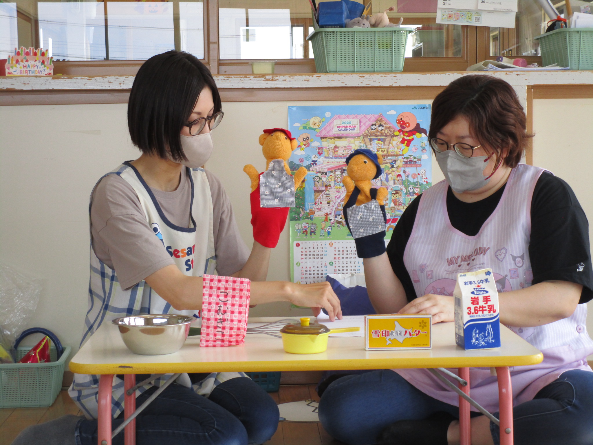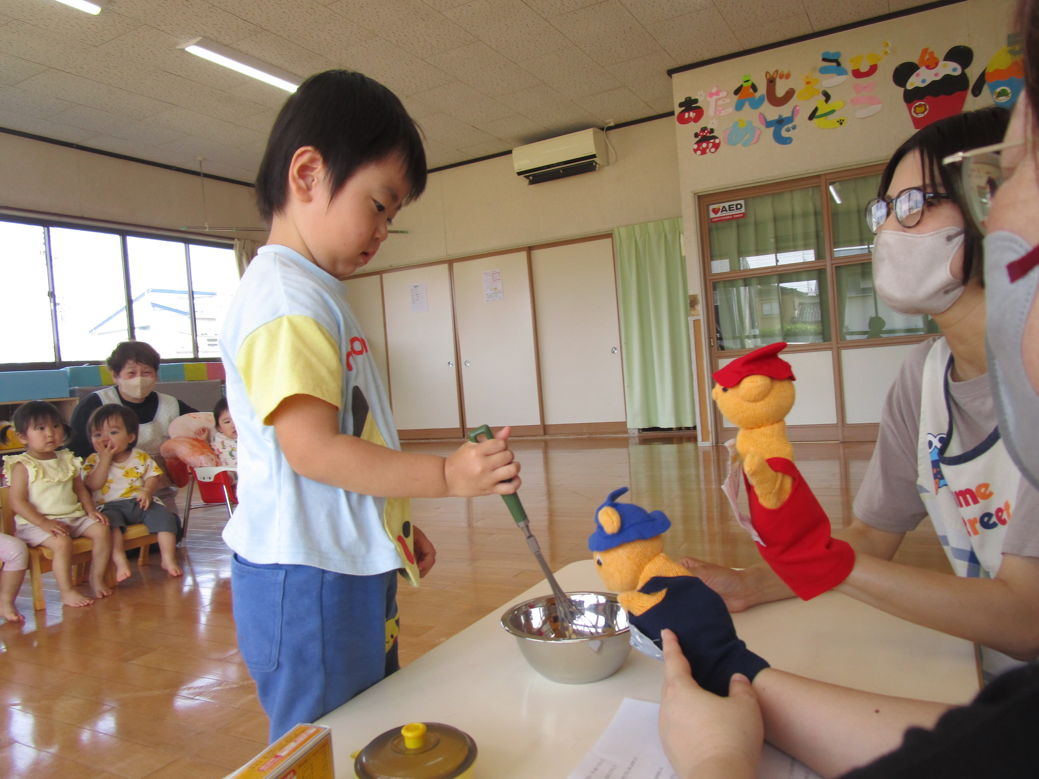 News 保育園からのお知らせ 2025/06/196月お誕生会🍒 6月のお誕生会は、“人形劇”!「ぐりとぐら」「さよならさんかく」のお話を見ました。実際に人形が動く様子を見て、子どもたちは目が釘付け😯アドリブいっぱいのお話しで、とっても楽しそうでした。 ぐりとぐらでは、カステラ作りをたんぽぽ組さんに手伝ってもらったり…カステラが出来上がるとちゅうりっぷ組さんを連れて食べに来てくれたり、大活躍!「さよならさんかく」では、しろくまちゃんやこぐまちゃんが、みんなの近くまであそびにきてくれたり…子どもたちもお話の世界に入り込んでとても楽しそうでしたよ! 一覧へ戻る